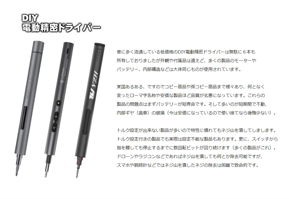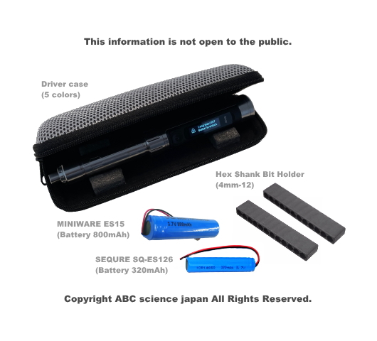 | パフォーマンス | MINIWARE(ES15)やSEQURE(SQ-ES126)電動精密ドライバーのパフォーマンスレベルは巷に多く流通しているようなDIY電動精密ドライバーとは全く違います。既にDIY電動精密ドライバーを所有されている方は下記の動画で比較してみて下さい。 |