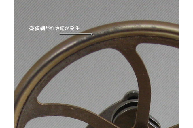 真鍮製に見せかけたスチールウィールは新品でも塗装が剥がれてサビが発生する。