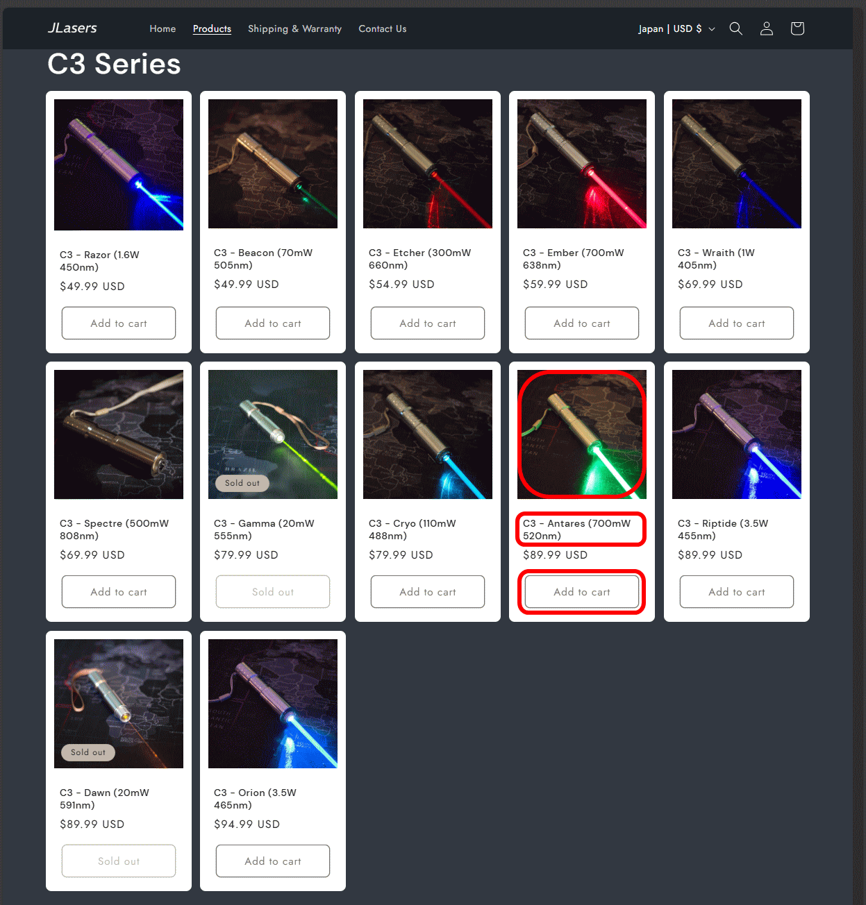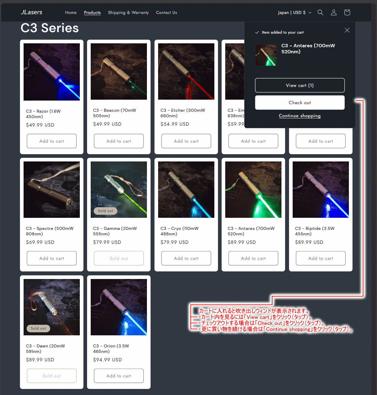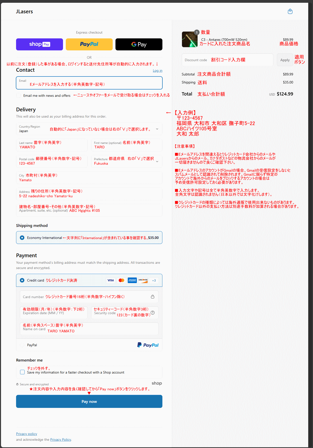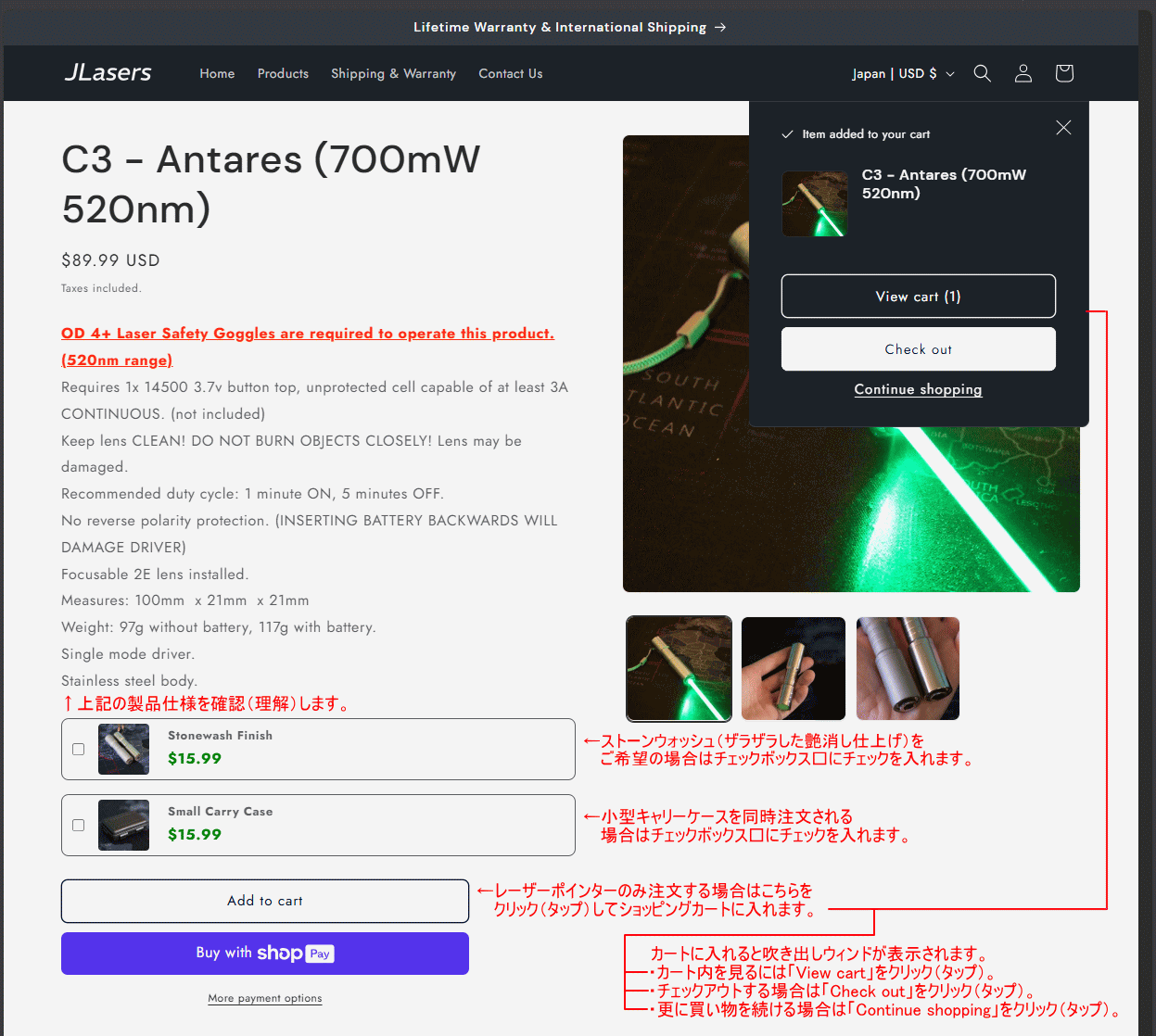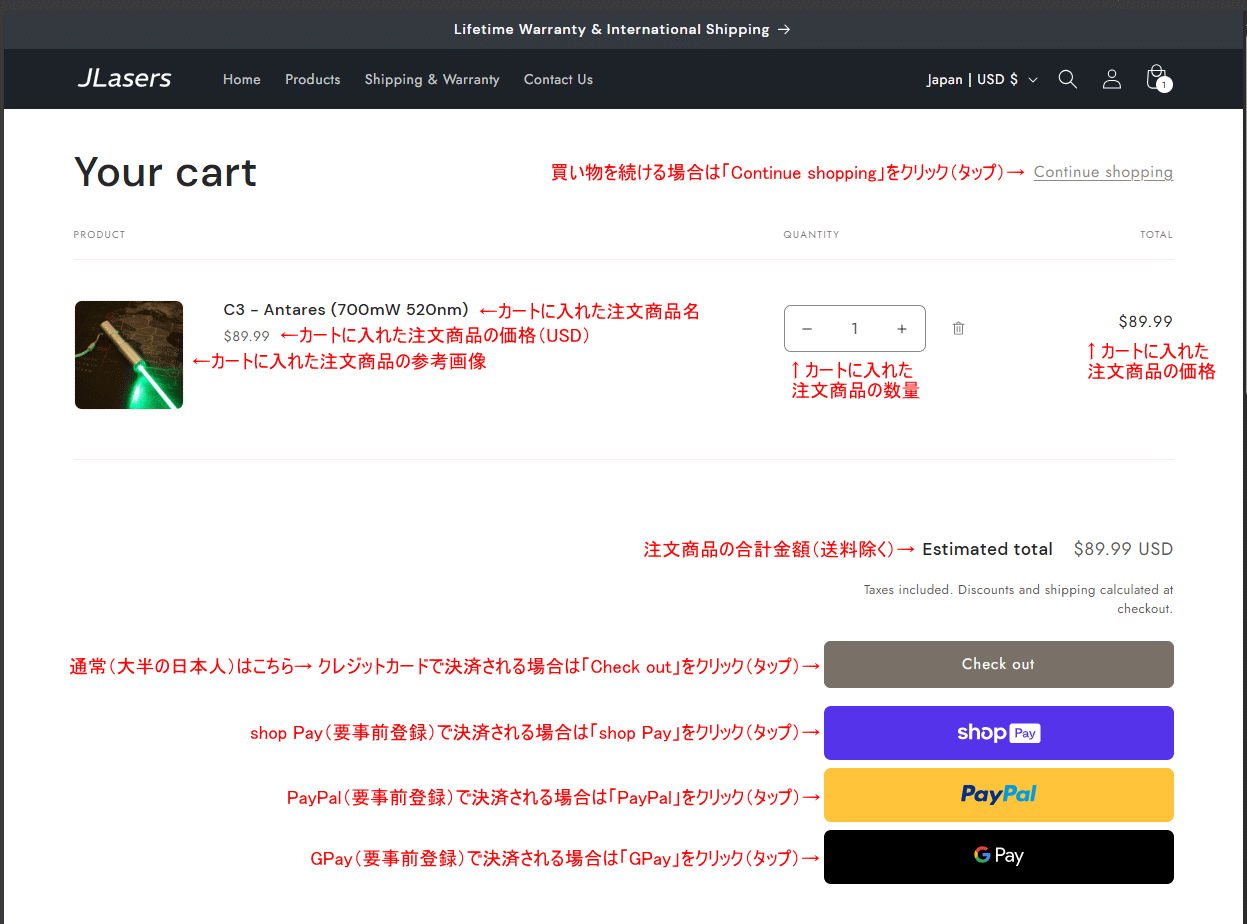 | 当ページは「JLasersカナダ製ハンドヘルドレーザーポインターの注文方法を日本語で紹介」しているページです。 ご注文される際の参考にしていただければ幸いです。何れも当店の販売商品では御座いませんので、ご注文および 輸入方法、製品の技術的・使用方法などに関するお問い合せはご遠慮願います(有償サポートの利用者様は除く)。 パソコンでもスマホでもレスポンシブ(自動振分けURL)で簡単に注文出来ます(当頁ではPCでの注文を解説)。 実際の注文画面の表示は、予告なく変更される場合が御座います(販売商品の種類なども入れ替わります)。 使用されるクレジットカード会社により2段階認証などが必要な場合や海外通販利用不可の場合が御座います。 また、支払うボタンをクリック(タップ)してから支払い完了ページが表示されるまでに時間を要する場合があります。 アプリなどでメールの受信設定などされいる場合は、注文に関するメールなどが迷惑メールフォルダなどに メールが届く、またはブロック(削除)されますので事前に確認(必要であれば設定)しておいてください。 パソコン画面で下記の各参考画像が小さくて見にくい場合は、ブラウザのウィンドサイズに対しての大きさに リサイズして表示されている場合がありますので、表示の設定変更やマウスポインタで画像をクリックして 大きい参考画像をご覧下さい(開いた画像にマウスカーソルを合わせると「+」「-」になりますのでクリック して下さい)。当頁はパソコンを使用した注文例を解説しております。※各解説画像の住所などは参考例です。 |