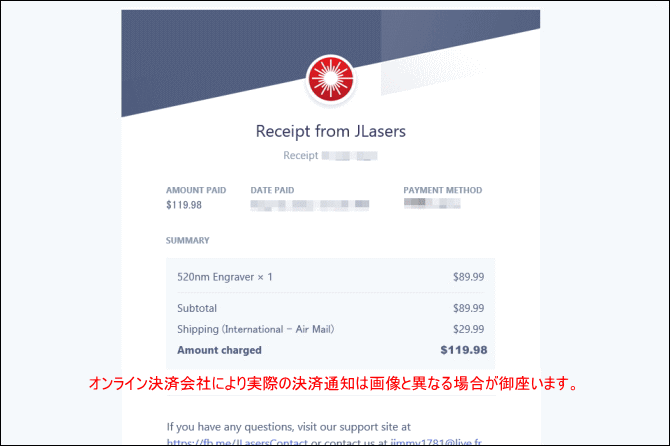 | 【決済後】決済ページで入力したメールアドレスにオンライン決済会社から決済通知が届きます(利用したクレジットカード会社からではない)。JLasersからも注文確認メールが届きますが、共に通知仕様変更の際は届きません。