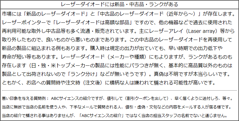 | 騙されないで | 通常はレーザーの波長や出力は製造元が製造段階や出荷前にチェックし、小売店なども依頼すれば出力を測定(測定値をYouTubeにアップロード)してから出荷してくれますので、ダイオードの波長や出力の間違いは高い確率で発生しませんが、「WEB翻訳などで下手な英語(威圧的・命令形)で問合わせ・注文した際」や、全くの初心者である事などを悟られると、足元を見られて騙されたりする事もあります。何を騙されるのか?と言うと、レーザーダイオードの製品の品質と下記の例などです。希に、ワンランク下の出力の製品が(単なる間違いか?意図的に?)送付される事例があるようです(例:5W注文→3W届く)。 |