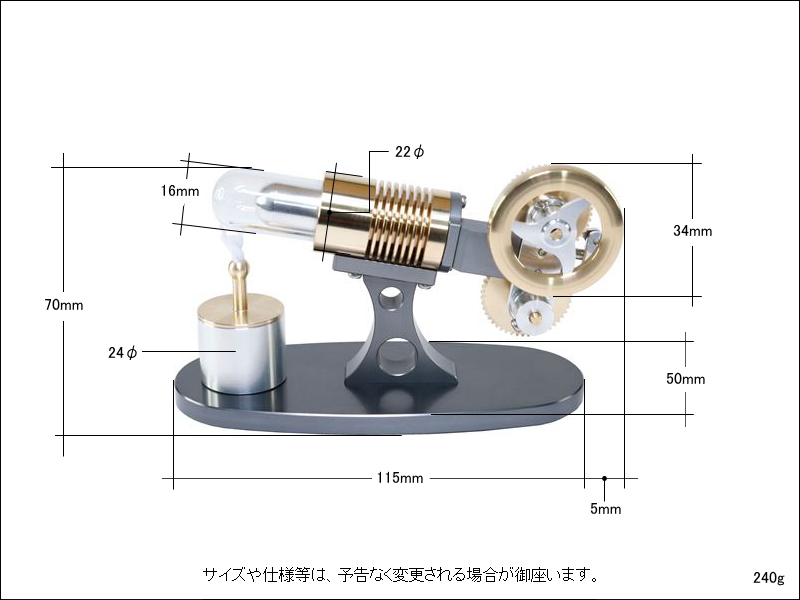 | オプション | 市販品でこの美しいメカニズムのエンジンは容易に入手出来ないでしょう。デスクのアクセントや、お部屋のインテリア(オブジェ)としても最適な逸品です。オプションのプロテクティブグラスドームはエンジンのディスプレイや保管にも最適なガラスドームです。 |