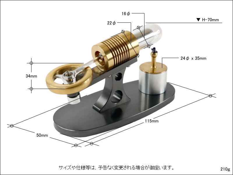 | マンソンエンジン | マンソンエンジンは内燃機関のような燃焼(爆発)工程が無い外燃機関ですので音が静かで排気ガスもない、室内で楽しめるミニチュアエンジンです。付属のバーナにはドラッグストアやホームセンター、ネット通販等で販売されている燃料用アルコールを入れます。 |
