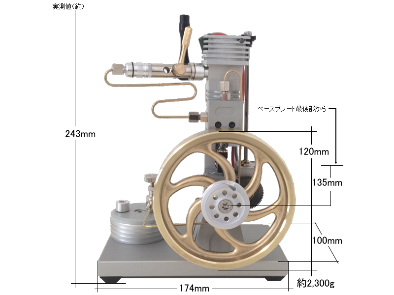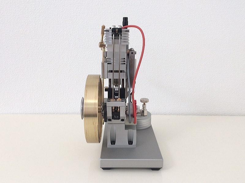 | ピエゾ点火 | ピエゾ高電圧点火システムを搭載しているのでスパークプラグ点火用の電源等も不要です。ガスタンクにガス(特定の推奨ガス)を充填してバルブ(速度調整可)を開き、フライホイールを回すと運転開始します。バルブの開閉でエンジンの回転速度を変えられます。ピエゾ高電圧点火システムのアニメーション、エンジンのサイクル参考アニメーションを見ると、仕組みが分ります。全6モデル共、基本的には同じ原理です。MM-4製品サイズ。 |