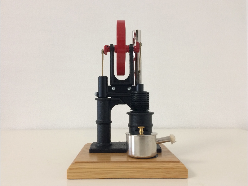 | スターリングエンジン | スターリングエンジンは内燃機関のような燃焼(爆発)工程が無い外燃機関ですので音が静かで排気ガスもない、室内で楽しめるミニチュアエンジンです。付属のバーナにはドラッグストアやホームセンター、ネット通販等で販売されている燃料用アルコールを入れます。 |
