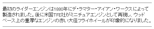 | 高性能・高品質 | ABC science japanオリジナル仕様です。外部出力プーリー付き。社外のアクセサリや発電機なども接続可能。PMR社のミニチュアエンジンシリーズ。 |