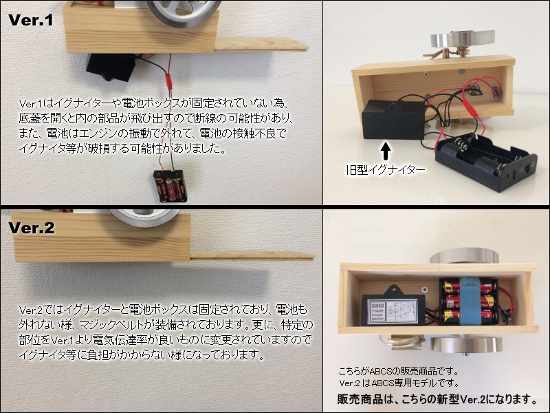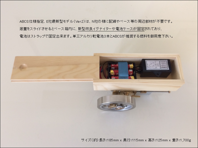 | 特徴 | ABCSモデル(2018年~2019年)はイグナイターや電池ボックスが木箱に固定された、バージョン2(Ver.2)のモデルでバルブ開閉タイミング等が適切に調整された改良モデルです。一般流通品のバルブ開閉タイミングの問題などがある劣悪商品とは異なります。 |