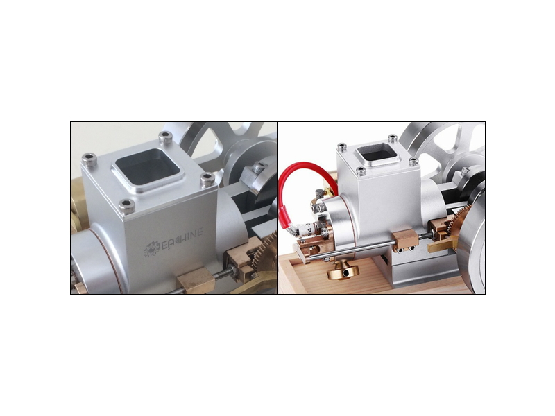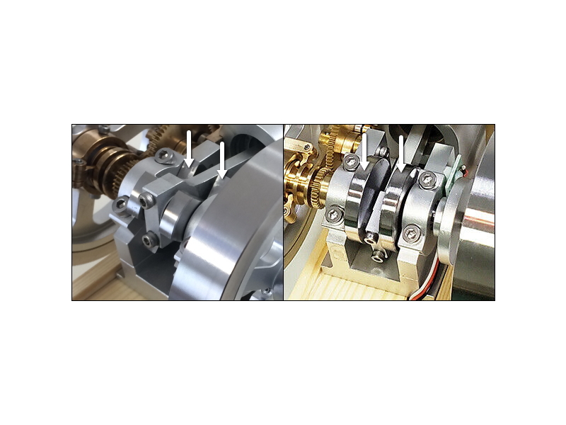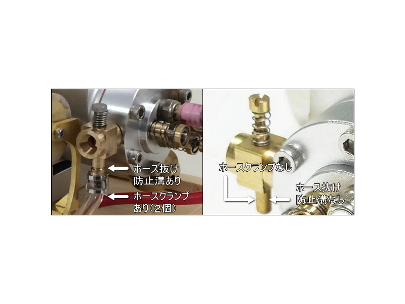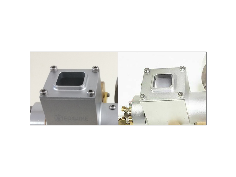 Eachine社の製品(左)はホッパーの口が広く、シリンダライナーの全体に水が回り冷却する。フェイク製品(右)はホッパーの口が狭く、シリンダライナーに水が回らず冷却効果なしの「見せかけの穴」(ホッパー参考YouTube)。