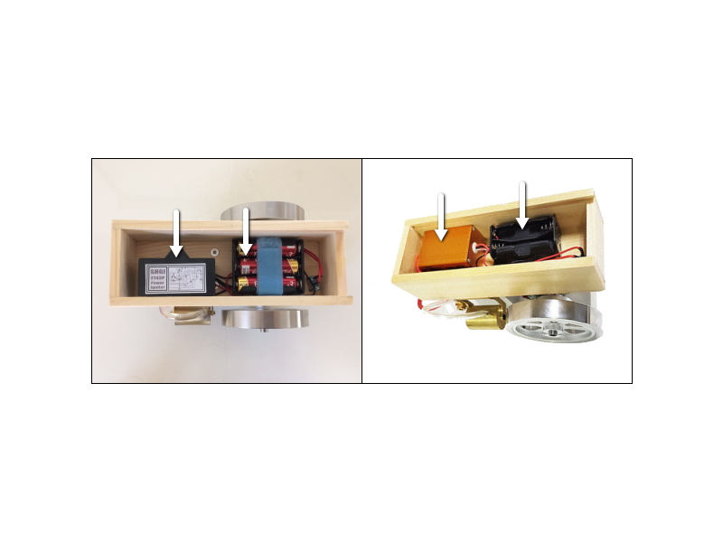 Eachine社の製品(左)は最新型イグナイタで単三アルカリ乾電池3本仕様です。フェイク製品(右)は危険な金色アルミ箱イグナイタで単三アルカリ乾電池3本~4本仕様です(金色アルミ箱は特に酷い品質)。
