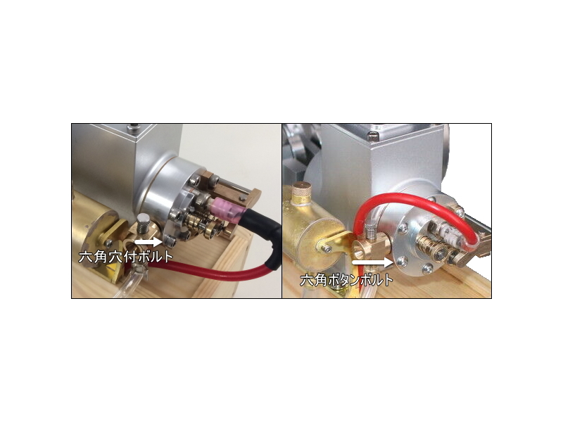 Eachine社の製品(左)六角穴付ボルトで高強度材で折れません。。フェイク製品(右)は六角ボタンボルトでコスト削減、ネジ潰れ、折れやすい。★結局はフェイク品は問題のあるEachine社の製品より酷い製品(プラグも異なる)。